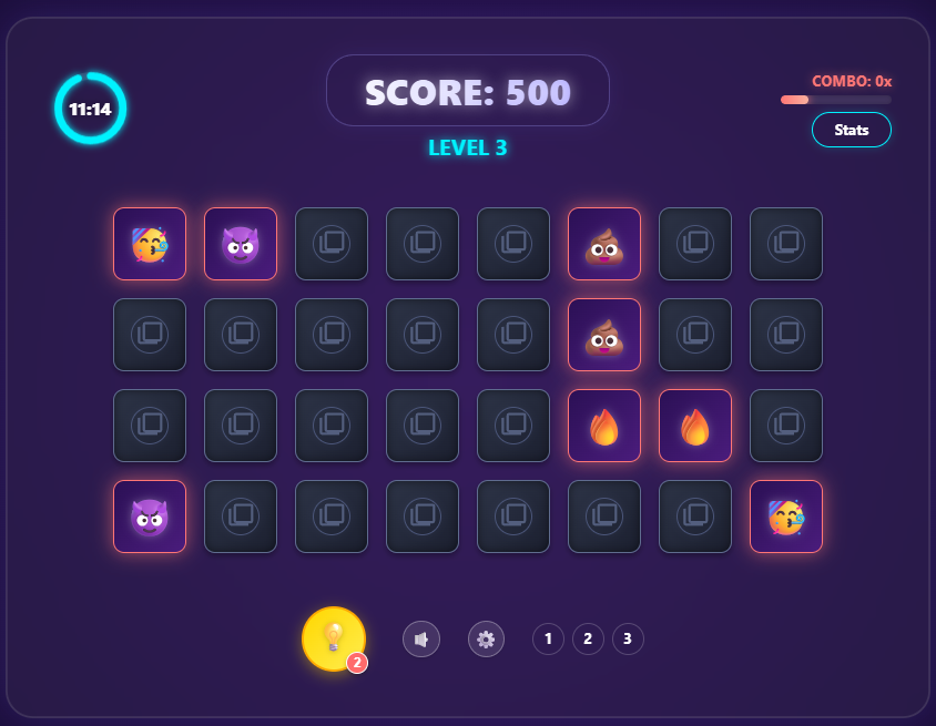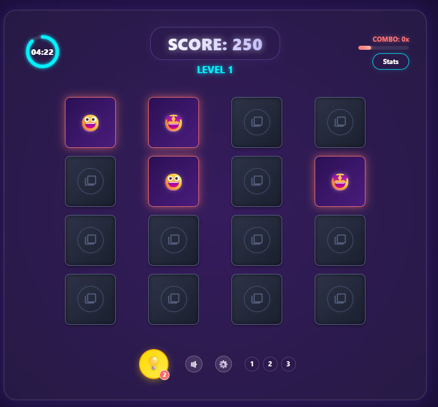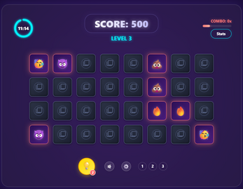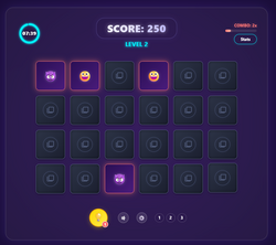 MojiMatch is a satisfying and modern memory game. Flip cards, match emojis, and beat the timer in a gorgeous glowing environment.